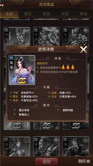 甄姬,魏国美人。其技能翩若金鸿,释放时候需要三个怒气。其效果是对全体目标造成150%d计策伤害。天赋为,气势:初始怒气+1;龙威伤害+22%:霸体伤害减免+22%;兵法 计策伤害+45%;鬼谋 计策攻击+30%。可谓是相当暴躁的纯输出。其羁绊为:魏文帝后、婆媳和睦、野兽佳人。