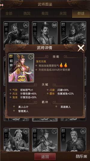 貂蝉,群雄美人。其技能落花无痕,释放时候需要二个怒气。其效果为对前排造成200%的计策伤害。天赋,气势初始怒气+1;闪避+30%;兵法计策伤害45%;霸体伤害减免+22%;计策攻击+30%。是一个对前排造成巨大杀伤力的暴躁美人。同时又自带闪避,轻盈但是暗藏杀机。其羁绊为美人心计、英雄美人、智者每人。