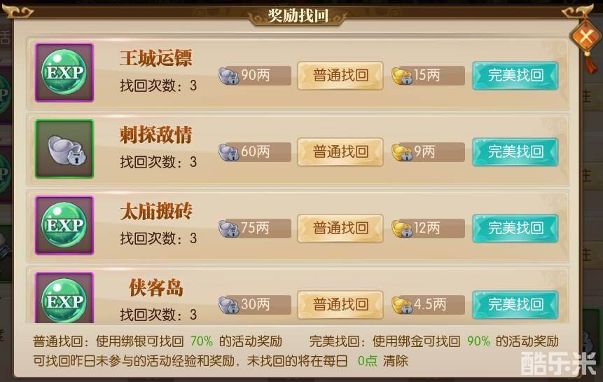 改:重新规划经验道具的产出,将各类经验道具的产出更加集中,在每日礼包中增加经验道具,同时调整经验月卡和周礼包经验道具的产出。将降低勇士们经验和道具找回需要的消耗,找回70%经验使用绑银,完美找回90%经验则消耗绑金。