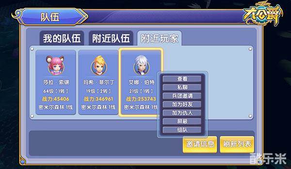 点击组队便可进入队伍系统,可自由选择创建队伍或者搜索附近队伍申请加入,创建队伍可在附近玩家中邀请对方组队,也可以在好友系统中点击好友头像邀请好友组队共同挂机刷怪或者副本活动。