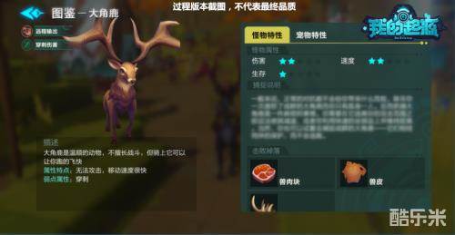 大角鹿是一种温和的食草动物,不会主动攻击玩家和怪物,只有受到攻击时才会反击。它们主要攻击是用头顶的角,会冲撞并击退敌人,血量低的时候会逃跑。而大角鹿的天敌则是蛮足龙,这群温和的食草动物看到周围有蛮足龙的时候会四处逃散。当附近有水域时,大角鹿会去喝水。不小心走到熔岩里的时候,它们会立刻跑出来。作为骑宠,大角鹿虽然无法攻击,但是移动速度很快,它能带着你在草原上疾驰!