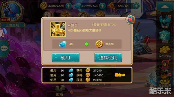 1、点金手:花费少量钻石在点金手界面使用、连续使用进行金币兑换。