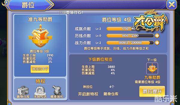 爵位作为《大公爵》中全新开启的一大特色系统,有着非常重要的作用。它是控制爵爷们提升的重要系统。提升爵位的等级,可以解锁更多的神技位,可以开启随身仓库,可以开启无限传送,可以开启精准强化等这些特权。当然,提升爵位也能增加角色属性。