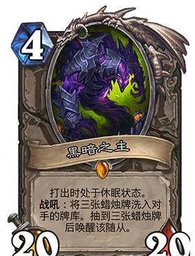 1.黑暗之主。黑暗之主4费20-20的身材简直不要太超模,但玩家得先往敌方牌库中塞上三张蜡烛,只要对面一日不把三张蜡烛抽完,我们这边的黑暗之主就一日不会苏醒。进化萨一旦把随从进化成黑暗之主,那简直比不小心吃了苍蝇还难受,首先对面牌库中不可能凭空冒出三张蜡烛,再来就是沉睡状态的黑暗之主是不能被选定的,意思就是进化萨玩家一旦进化出了黑暗之主,请神容易送神难,随从格子直接-1。