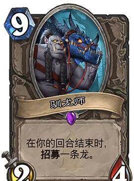 2.驯龙师。驯龙师可是当年墙德必带的一张9费随从,只要驯龙师一直存在于场上,每回合结束的时候驯龙师都会帮助玩家从牌库中召唤出一条龙,在墙德的眼中,在一回合内一只驯龙师至少能拉出一只始生幼龙,拉出来一只贪睡巨龙也是不错的。如果进化萨进化出了一只驯龙师出来,问题也随之而来,进化萨的卡组中会带龙这种生物吗,相对于其他9费的随从,驯龙师2-4的身材实在是弱了。