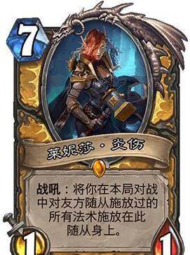 4.莱妮莎·炎伤。作为炉石传说中颜值比较高的随从之一,玩家们亲切的称呼这张卡为“小姐姐”这张圣骑士的专属传说随从莱妮莎·炎伤的战吼效果简直不要太强,玩家在这句游戏中释放的所有buff类法术,都会再次释放于小姐姐身上,什么剑龙骑术、力量祝福都不要钱的释放。不过进化萨看到小姐姐可是会难受半天的,像一些非洲进化萨玩家,6费刚进化出一个犯罪高手,结果7费又出来一个小姐姐,所以玩家到底拿什么拯救天灾的冰冻之心。