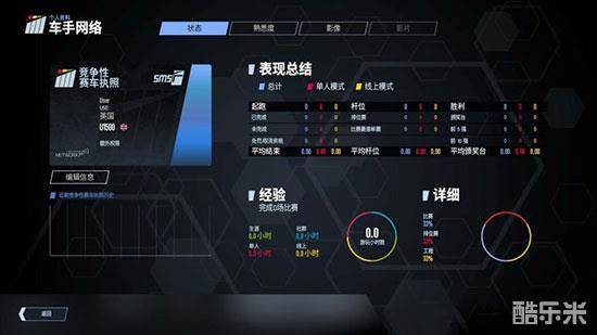 车手网络中显示你的个人资料。你可以在此检视你的赛车竞争执照的细节,编辑你的在线个人资料的信息,以及观看你的所有游戏成绩、相片及影片。
