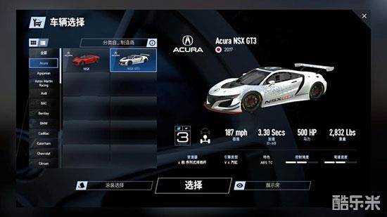 在此你可以选择要驾驶的车辆。车辆会以制造商列出,但你也可已用“分类”选项以车辆等级列出。或者,你也可以按字母检视。