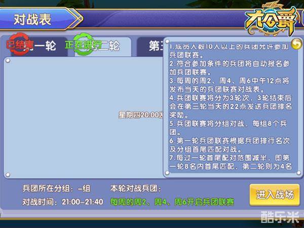 联赛会根据兵团排名名次及分组首尾匹配每周进行三轮对战,在每周二、周四、周六的中午12点公布对战表,当天晚上的21:00-21:40开启对战,第三轮对战结束的当天22点发送军团排名奖励。