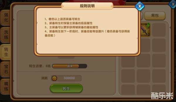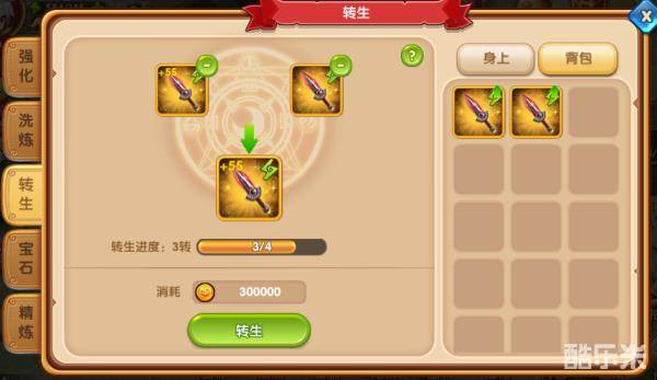 然后放入相同品质的同部位的装备就可以给主装备转生啦,每次转生固定增加基础属性喔,其他属性并不会改变噢