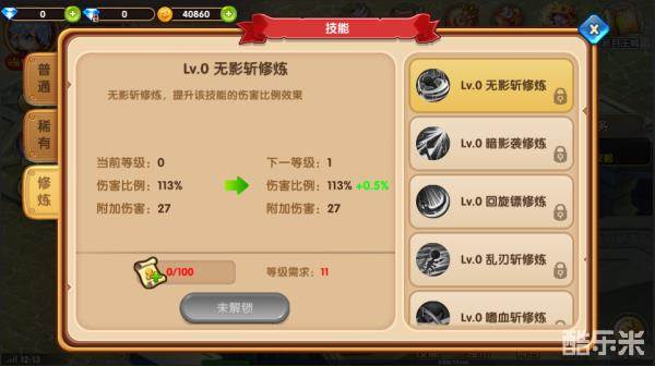 修炼:这个是技能的伤害强化技能噢 ,每次升级都可以提升我们角色技能的伤害喔,也是消耗金币的噢