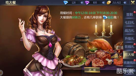 吃大餐这个福利是每位玩家每日必做的一项内容!用餐时间为中午12:00-14:00;下午18:00-20:00,主要产出是为大家提供免费的体力,用来进行更多的战斗。而且还有几率获得钻石哦!~
