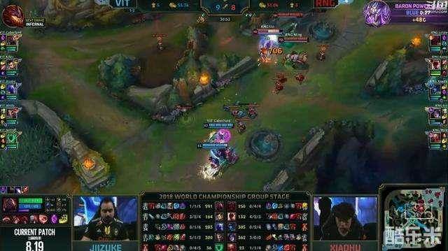 开局伊始,由于下半区战斗力差距较大,RNG就摆出了防守的铁桶阵,做了相当完美的视野布控。VIT也是疯狂针对RNG下路,一会儿4个人一会儿5个人的,打野基本住在下路,但是由于RNG出色的视野和VIT自己稍显粗糙的处理,让RNG拿到了机会,野辅收获了人头。但是被阵容限制了拳脚的RNG并未扩大什么 优势,比赛到了中期,阵容的差距打破了脆弱的平衡。在RNG的一次小小失误后,VIT的德莱文迅速发育了起来,取得了英雄+经济的双领先。