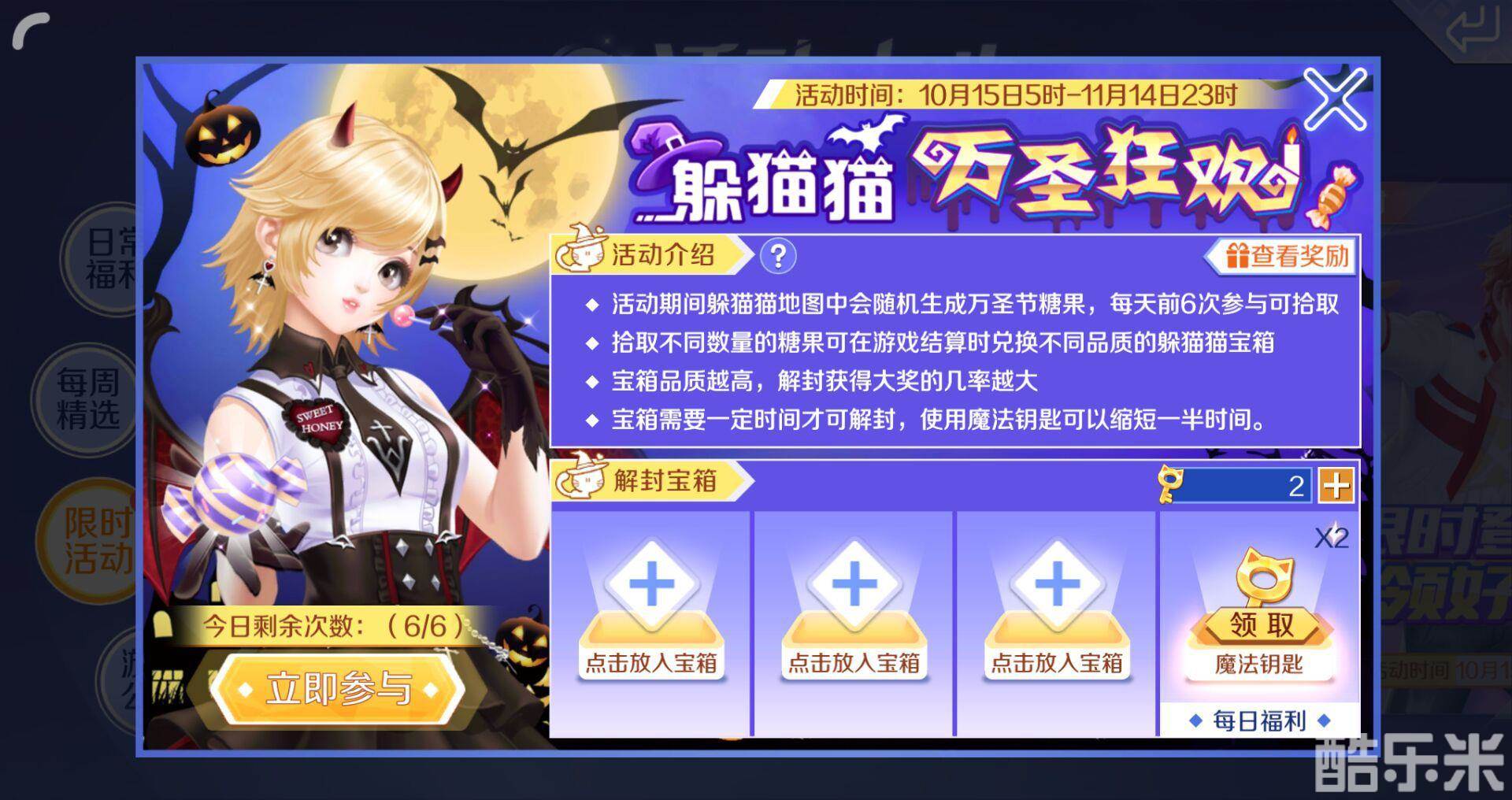 万圣躲猫猫地图中会随机刷新糖果宝箱,每日前6次参与拾取;不同数量的糖果还能兑换万圣躲猫猫宝箱,打开宝箱有几率获得专属套装哦!嘿嘿~为dancer们准备了这么多福利,你们到时候可不能捣蛋呐!