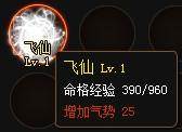 40级的时候开启第三个命格配置。前面有了轩辕剑体,那么第三个命格配置不用说,一定是飞仙。飞仙的作用是增加气势,气势的作用是让飞羽能够放出技能。气势越高,就能越早放出技能。所以将飞仙的等级提升到6级,这样飞仙可以增加50气势,也就意味着飞羽在第一次出手的时候就可以放绝技攻击,加上轩辕剑体,基本上一次就可以让对方的一个人失去出手的机会。