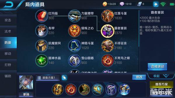 出装详解:这套出装首先做出的近卫荣耀前期可以弥补游走造成的经济损失,中后期团战可以提高队伍的伤害输出,这件装备对于游走频繁的辅助性价比比较高,随后的不死鸟之眼是东皇太一必出的一件装备,用于提高技能的回复效果,随后做出极寒风暴在先手开团后可以打出范围伤害和减速效果,再做出魔女斗篷提高东皇太一的法术防御能力,最后一件依然选择贤者的庇护提高生存能力。