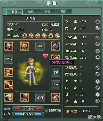 5)结为夫妻后,双方人物与角色属性面板点亮爱心标志,并且增加角色夫妻称谓。