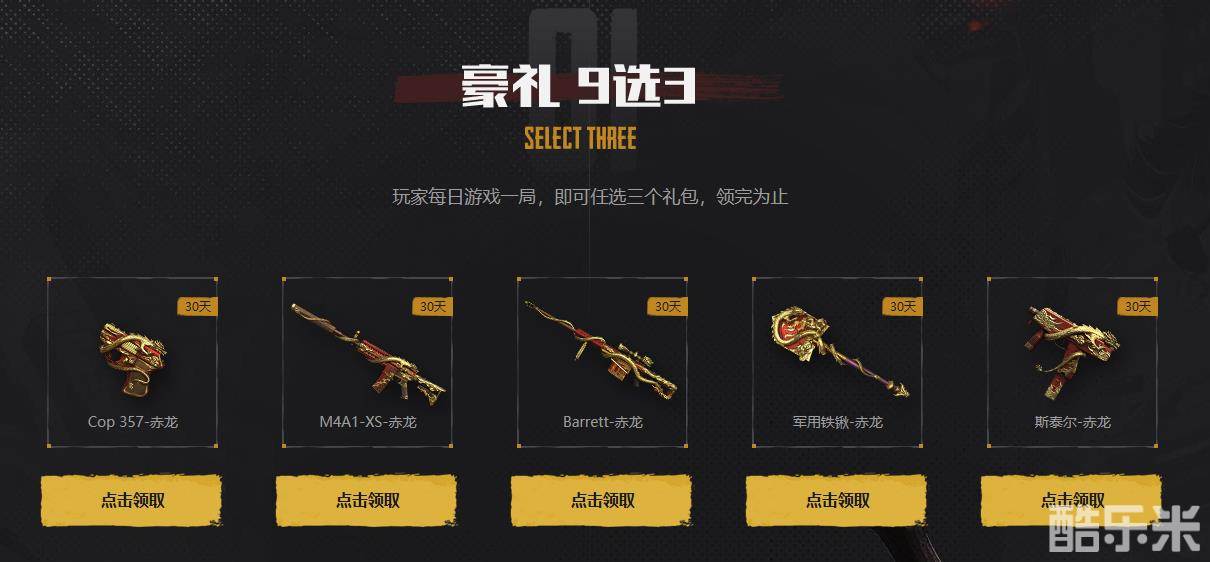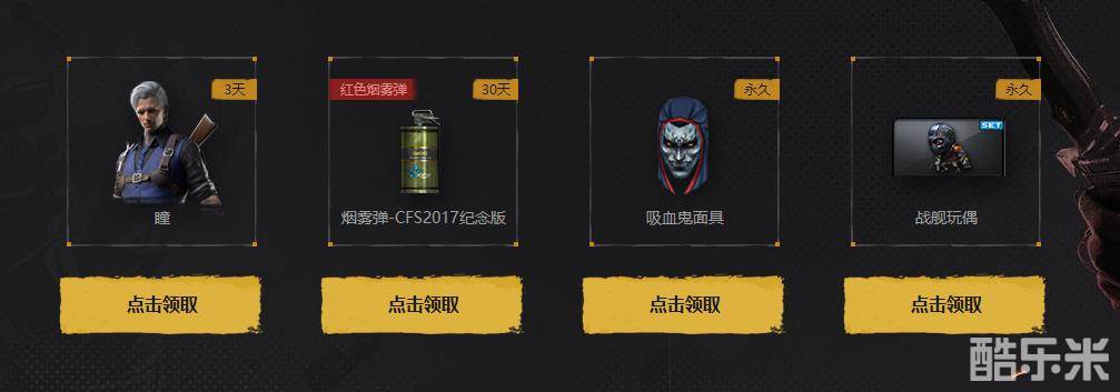 首先是有九件奖励在等着我们挑选,只要每日游戏一局即可任选三个礼包,由于是领完为止,大家也不必纠结如何选择。其中可是包含有超实用的赤龙五件套,每一款都是整整30天期限喔!由于其中囊括了不同的武器类型,从主到近战武器、又从步枪到冲锋枪,相信足以满足大家的不同需求。不仅如此,本次还送出了CFS2017纪念版的烟雾弹,在极具纪念意义的外观之下,其可是能够散发出红烟的呢。