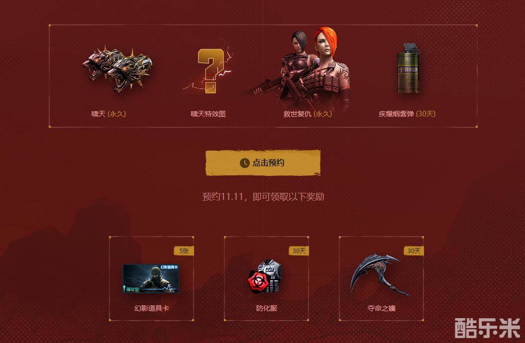 而在本次活动最后,同样也是有着双十一活动的预约版块。其中那全新的啸天、救世复仇和疾爆烟雾弹,每一款都是十分值得期待。与此同时,只要我们在此页面点击预约,那么即可将领取五张幻影道具卡。真可谓是小手一抖,福利就有!同时还有超实用的防化服和夺命之镰,每款都是30天期限,相信它们足以在全新的30人生化中助我们一臂之力!