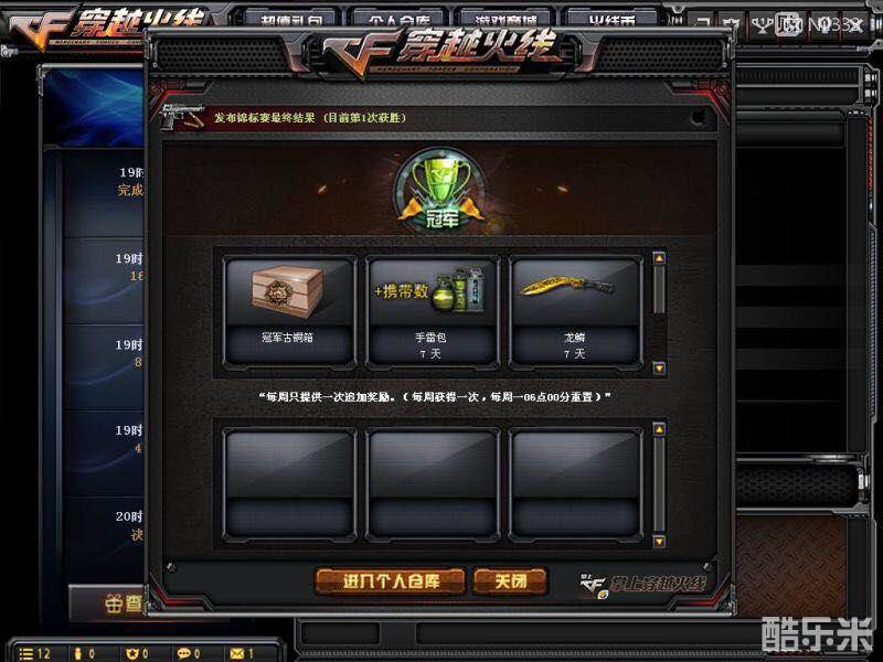 当然最让人好奇还是比赛的奖励,比赛结束不同名次有不同的奖励。比如火线币、GP点、黄金AK47、胜利之魂、手雷包、暗金鹰爪和龙鳞等。这些虽然是期限奖励,不过重头戏是拿到冠军的奖励哟~