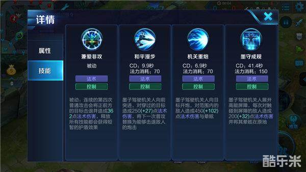 三技能-墨守成规:墨子展开高能屏障,每次对触碰到屏障的敌人造成法术伤害并将其晕眩在原地。