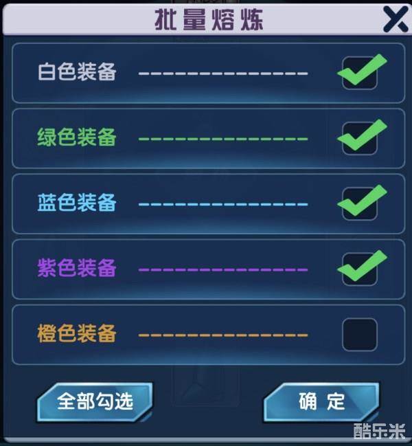 由于装备有各种等级,所以大家在选择批量熔炼的时候根据自己的意愿来进行勾选啦(不过除了橙色装备其他都可以熔掉其实)