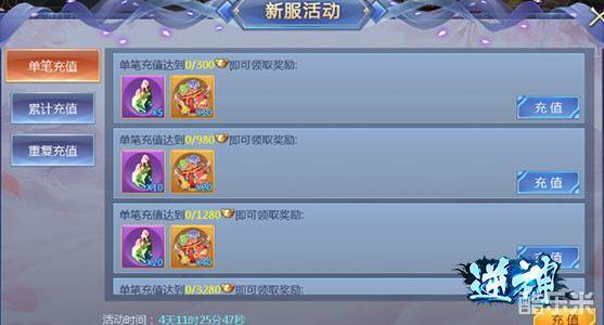 新服活动包括单笔充值、累计充值和重复充值。