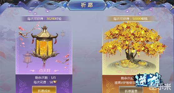 祈愿分为点天灯和摇钱树。点天灯和摇钱树每天都有一次机会,点天灯每次需要花费50元宝,摇钱树免费。点天灯每次可以获得30240经验,摇钱树每次可以获得50000铜钱。