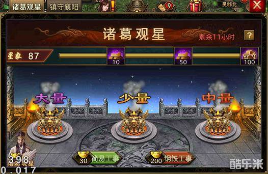3、星象值达到指定值时,可建造工事增加,陨铁奖励增加,并可获得“孔明锁碎片”或“孔明锁”;