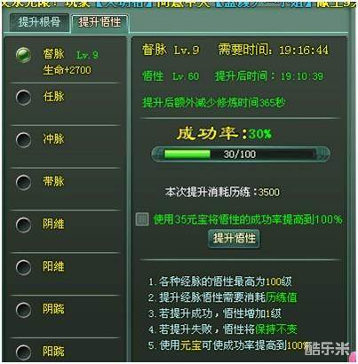 悟性提升只是单纯的消耗个人历练,不需要花铜币跟元宝,这点4399做的还是不错的。如果你历练很高,强烈建议你把这8个悟性都提升到60,至少也要全套提升到40.我用小号试过一次历练150W鼠标狂点的话8个全部提升到60是很轻松的事情,悟性高了你升级经脉的速度才能很快,新区的朋友们看懂了么?