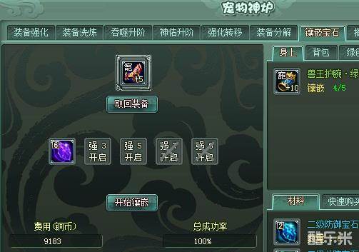 1.1 宠物装备按照强化等级开孔,强化1/3/5/7/9依次开启五个孔;