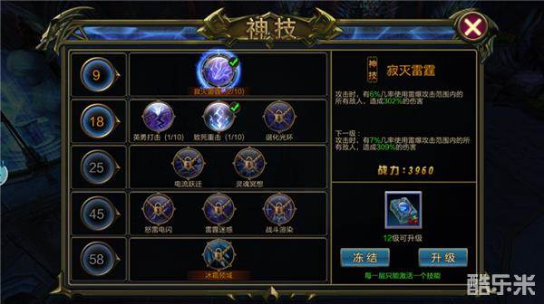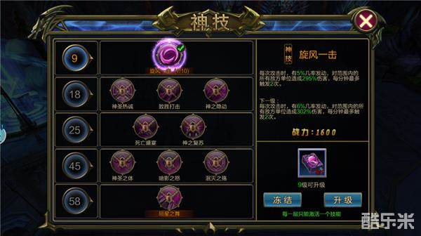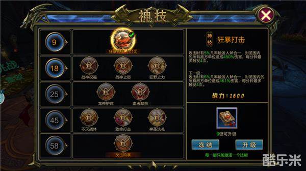 第二层:可以理解为增加战斗属性,攻击敌人有几率增加战斗力、暴击率或移动速度【划重点:同一层仅能激活一种神技,当然,玩家可以随意冻结和激活】。