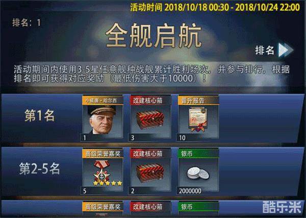 【参与方式】活动期间使用3-5星任意战舰累计胜利场次,并参与排行,根据排名即可获得对应奖励(最低伤害大于10000)!