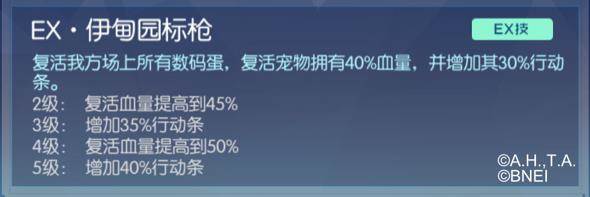 EX技能,可以为全体队友回复天女兽自身生命上限20%的血量,同时还可以增加50%的防御。这是一个非常强大的群体回复技能。血量多少意味着场上数码宝贝的生存时间,20%的回复明显是很给力的,同时还可以增加防御,进一步延长了队友的生存时间。
