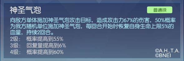 普通攻击,可以造成攻击力67%的伤害,并有50%的概率为友方数码宝贝加上持续回复血量的效果,持续2回合,每回合恢复天女兽生命上限5%的血量。这个效果使天女兽可以在普通攻击的同时也能进行一定程度的回复。