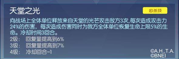 必杀技,这是个群体攻击技能,可以对敌方造成3*24%攻击力的伤害,同时也是群体回复技能,可以为友方全体回复天女兽生命上限3*5%的血量。这是一个重要的回血技能,并且可以群体回复,可以延长队友的生存时间。