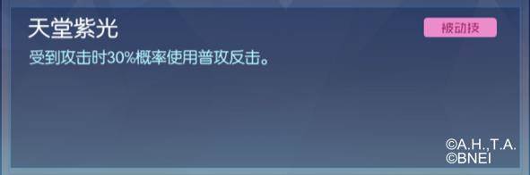 被动技能,受到攻击时有30%的概率反击。配合天女兽普通攻击的效果,这个被动技能使它在受到攻击时也有可能对队友进行回复。