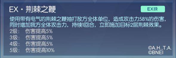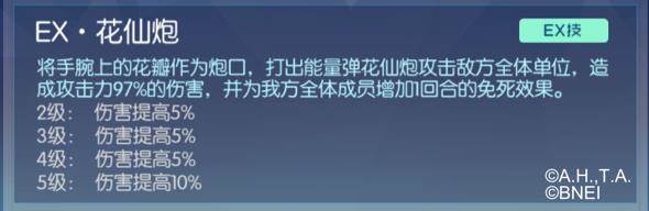 EX技能,群体攻击造成伤害,并且为友方全体数码宝贝增加一回合的免死效果。这个EX技能提供的免死效果,在危机时刻非常有用,尤其EX技能是可以手动释放的,选择好这个EX技能的释放时机可以为战斗结果提供更多的可能性。如果配合其他有恢复能力的数码宝贝,就可以延长友方数码宝贝的生存时间,甚至节省一次复活技能的释放。