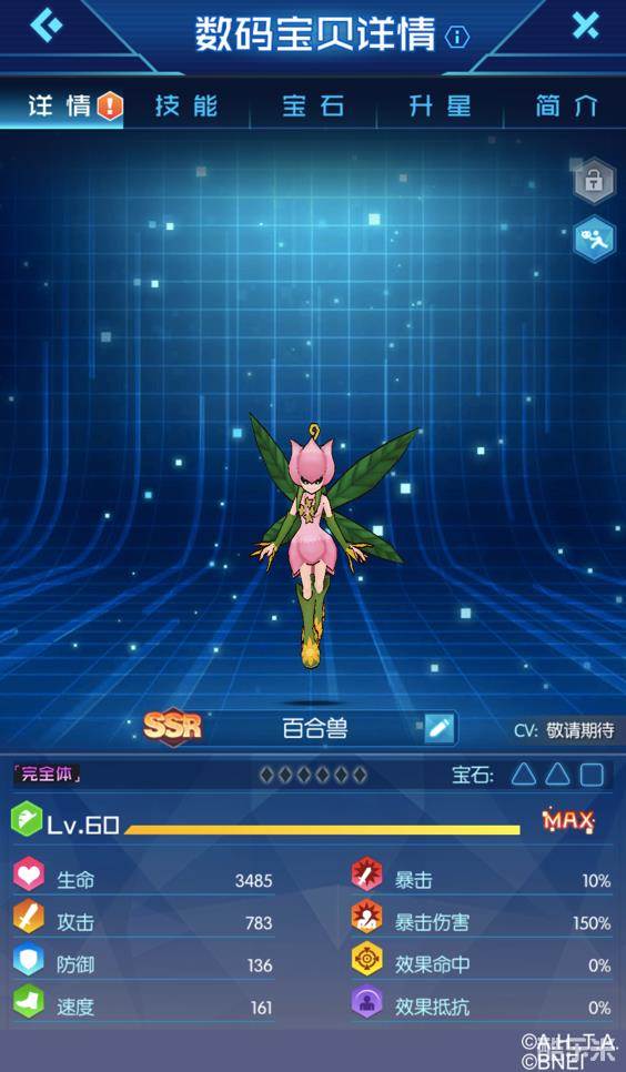 百合兽是一只完全体数码宝贝,所以可能存在两种稀有度的百合兽。因为卡牌的稀有度决定了这只数码宝贝进化的上限。SR稀有度的百合兽无法进化到究极体,而SSR稀有度的百合兽则可以进化为究极体蔷薇兽,并且技能栏会多出一个可以进化技能------【百合兽进化】。