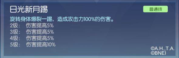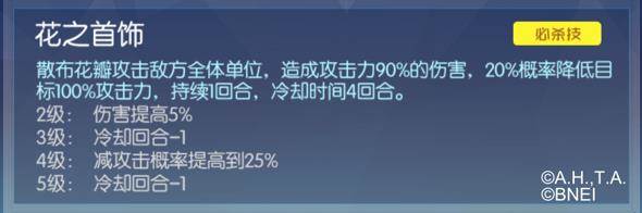 群体攻击技能,可以攻击全体敌人,但是伤害一般,只有攻击力的90%。相比于伤害输出,更值得关注的是这个技能的附加效果,有20%的概率降低目标100%的攻击力1回合。这就是说,一旦这个效果生效,目标敌人下一回合的普通攻击将无效化,敌人放出的大于100%攻击力的攻击技能效果也会被削弱。这从侧面保护了友方数码宝贝。