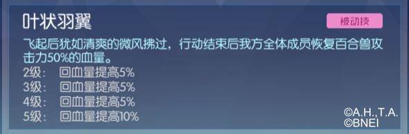 群体恢复血量技能,可以为我方全体数码宝贝恢复血量,值得注意的是,回血量的多少是由百合兽的攻击力决定的。因此,如果希望提高百合兽的回血能力,就需要一定程度上的提高它的攻击力。这使得百合兽在具有回复能力的同时,也具有一定的攻击力。