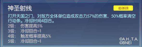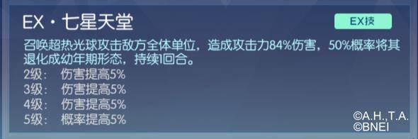 EX技能,对全体敌人造成63%攻击力的伤害,并清空有减益效果的目标的行动条。这个技能的存在加强了神圣天使兽清空敌方行动条的能力。尤其是和其他拥有制造减益效果能力的数码宝贝配合起来,会有不错的收获。