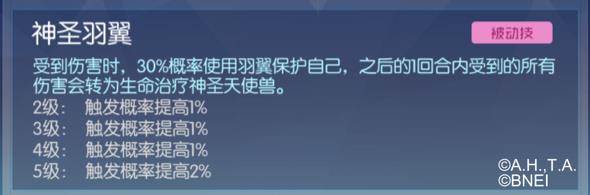 被动技能,有30%的概率使下一回受到的所有伤害转化为对自己的治疗。从神圣天使兽其他的技能效果可以看出,它在战斗中的存在是十分必要的。而将伤害转化为治疗,这个被动的存在增大了神圣天使兽的生存能力,同时也减小了治疗型数码宝贝恢复的压力。