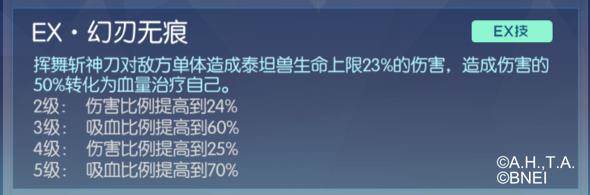 SSR稀有度的数码蛋兽多出的【数码蛋兽进化】这个技能,意味着在战斗时命令数码蛋兽使用EX技能时,它会先进化成泰坦兽,然后使用泰坦兽的EX技能【幻刃无痕】。