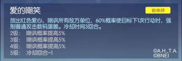 必杀技,嘲讽敌方全体,60%概率使目标下次行动时强制普通攻击数码蛋兽。这是一个很特别的但是很有作用的技能。一旦这个技能生效,可以强制敌方下回合普通攻击数码蛋兽,这样即保护了友方数码宝贝,也封住了敌方数码宝贝的一些必杀技能,对友方很有利。