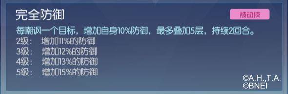 被动技能,每嘲讽一个目标,即可增加自身10%的防御,最多叠加5层,即最多提高自身50%的防御。这个被动技能对于数码蛋兽非常重要。作为一个主要通过嘲讽来保护友方的数码宝贝,防御是非常重要的属性,决定了它的生存能力。而这个被动技提高了它的防御,提高了它的生存能力。