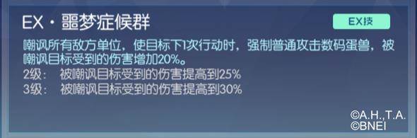 EX技能,嘲讽敌方所有数码宝贝,使它们在下一次行动时强制普通攻击数码蛋兽,且被嘲讽的数码宝贝受到的伤害增加20%。这个EX技能是加强版的必杀技,不用考虑成功的概率,必会成功,可以保护友方数码宝贝,也可以从侧面增大友方数码宝贝的输出。