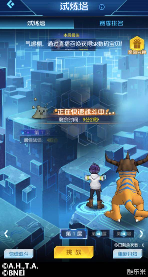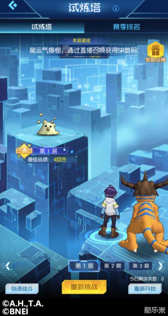 试炼塔是一个单人挑战的多层关卡,每层遇到的数码宝贝种类和特点不尽相同。玩家需要逐层击破,挑战极限。
