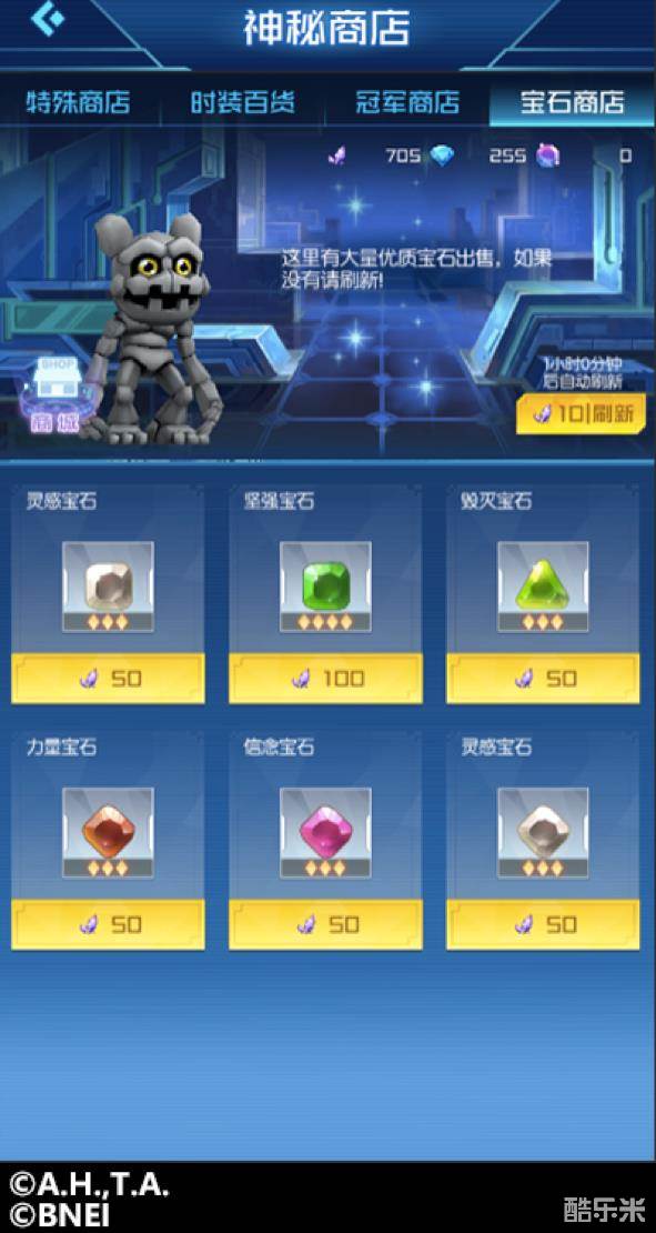 点击“奖励兑换”可以进入神秘商店中的宝石商店。在这里可以用通关试炼塔获得的宝石碎片来兑换各种宝石。如果现有的宝石没有中意的,也可以使用宝石碎片来刷新商店内的宝石。