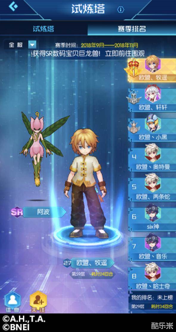 每个赛季会根据玩家通关的最高层数生成排行榜,记录当前赛季通关层数最高的前三十名玩家。培养数码宝贝,根据每层数码宝贝的特点搭配应对阵容,努力突破极限,挑战更高的层数,就有可能榜上有名哦!